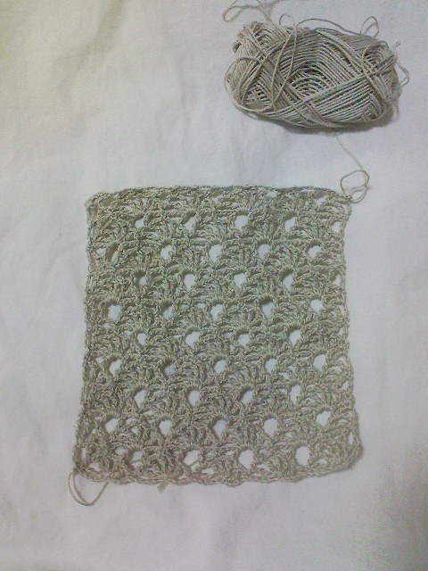 先日編んだコットンリネンラメの編み地を持って