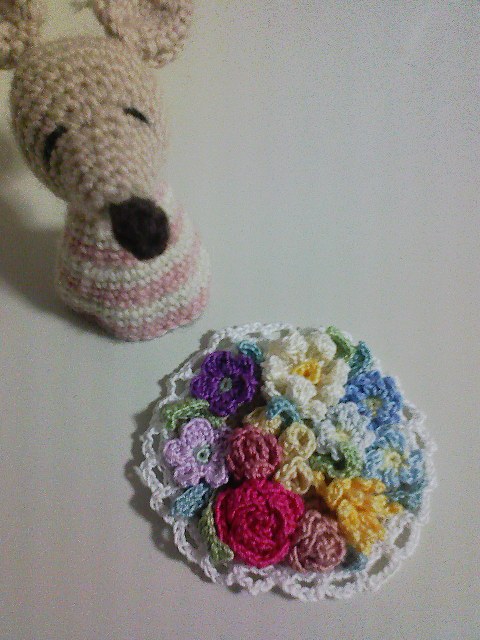 丸く編んだ土台にいろんなお花モチーフを寄せ集めて