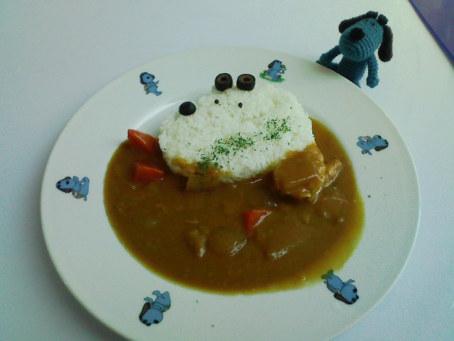 ラフくん:ぼくの顔のカレーだワン!おいしそう~お皿にもぼくがいるね♪
