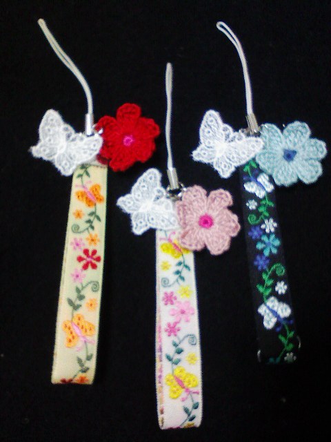 蝶の形のレースと、お花の1つに合わせて編んだお花モチーフをつけて